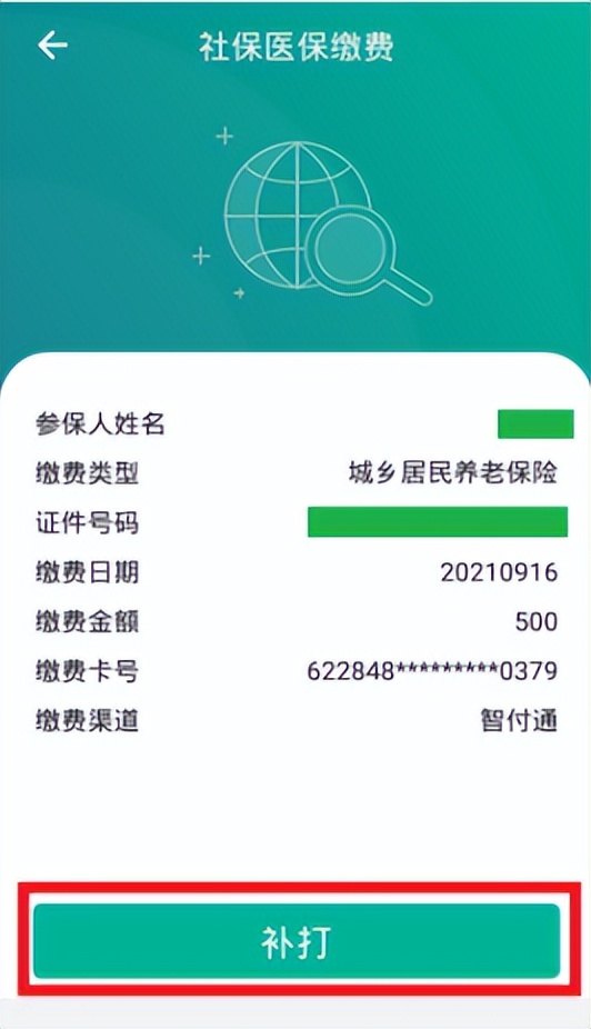 柜员根据缴费人提供需要查询的缴费人身份证号码及缴款日期进行查询,并提供补打缴费记录的回单。