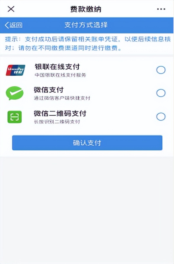 目前,缴款方式支持银联在线支付、微信支付和微信二维码支付三种方式(银联在线支付需银行卡开通银联在线支付功能),缴费人可以选择其中一种支付方式进行缴纳。