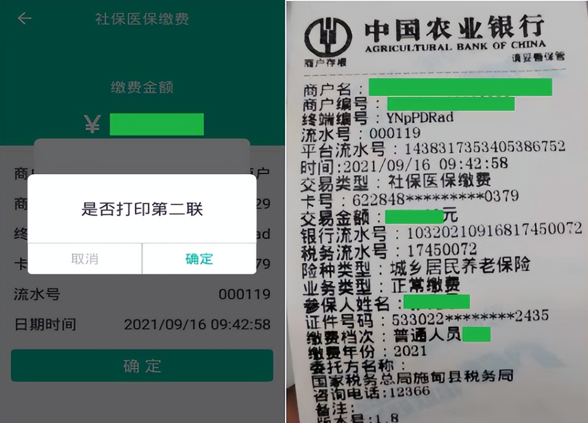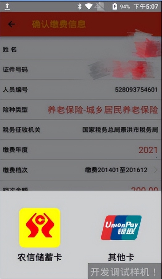 选择缴费险种、缴费年度、缴费金额等信息后,从插入的云南农信银行卡中进行费款扣除。