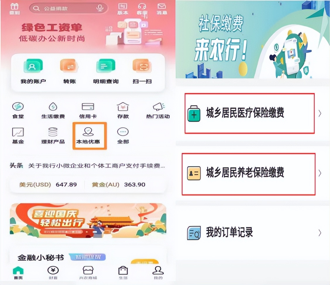 登录农行掌上银行后,通过【本地优惠】-【城乡居民两险缴费】进入,选择缴费险种(医疗保险/养老保险)。