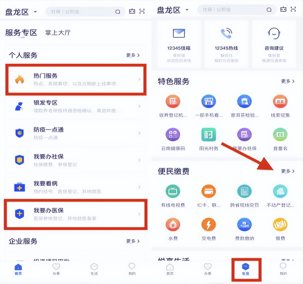 打开“办事通”APP,选择首页-热门服务/我要办医保-医疗保险缴费,或通过生活-便民缴费-更多-医疗保险缴费、养老保险缴费、医疗保险缴费和养老保险缴费两个入口均可选择,内容一致。