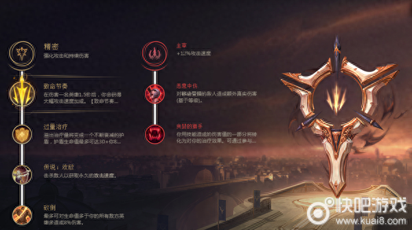 小编为大家带来的霞的符文推荐是精密系列,第一个致命节奏可以为霞的攻速提供不错的收益,霞也很需要攻速的加成,过量治疗对于一个身板比较脆的霞来说收益还是很不错的,传说血统可以为霞的吸血能力达到更高,砍倒对霞打坦克的能力提高了不少,在主宰系中,恶意中伤可以让霞的伤害最大化,贪婪猎手增加一些回复能力。