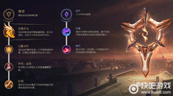 小编为大家带来的烬的符文推荐是精密系列的符文,经过最近几个版本的更迭,现在的烬已经不是巅峰时期了,不过伤害已然很爆炸,迅捷步法有点类似于现在版本烬点的战争领主的嗜血效果,过量治疗就是给这些没位移能力的ADC的保护手段,传说血统可以很好的吸血,而砍倒为烬提供了不错的破甲能力,而副天赋点出巫术,首先点了迅捷,迅捷可以为烬的移速提供了帮助,因为烬是很依赖移速的,而焦灼对于烬的W技能和W技能都有非常高的帮助。