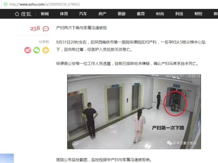 2017年8月,陕西榆林市第一医院绥德院区妇产科,一名产妇跪求丈夫在剖腹产同意书上签字,丈夫拒绝签字,拒绝的原因是:剖腹产比顺产花钱多。产妇疼痛难忍,多次沟通无效,绝望无助从5楼跳下,伤势过重,抢救无效,一尸两命。产妇死亡后,产妇的丈夫仍然认为自己没错。