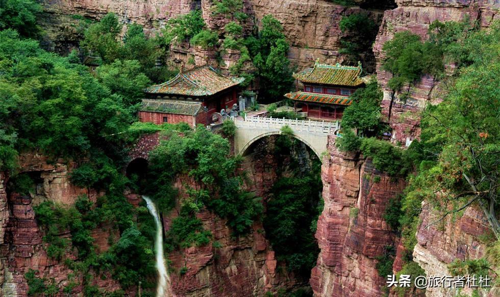 10、石家庄苍岩山:群峰巍峨,怪石嶙峋,深涧幽谷,古树名木,清泉碧湖,构成了奇特、幽静、秀丽的自然景观。千年古刹福庆寺以悠久的历史和卓越的建筑艺术构成奇异壮观的人文之美,使之享有“五岳奇秀揽一山,太行群峰唯苍岩”之美誉。
