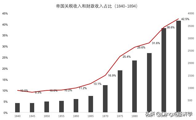 因为被迫扩大通商,海外贸易带来的关税激增是这个时期唯一的好事情。第一次鸦片战争结束后,随着广州、福州、厦门、宁波、上海五口通商的开放。清朝的对外贸易飞速增长,关税收入也明显提升。鸦片战争前(1840年),帝国每年的关税收入约400万两,而且长期不变(税收制度低效可见一斑)。到1871年也就是同治十年,关税收入突破1000余万两白银,三十年内涨了1.5倍。