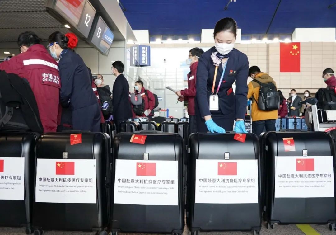 图注:2020年3月12日,中国首批援意医疗专家组9名专家和9吨物资搭乘东航航班飞赴罗马