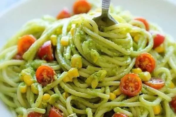 2、做好的牛油果泥和煮熟的意面拌匀,加一些小番茄和玉米粒就完成啦。
