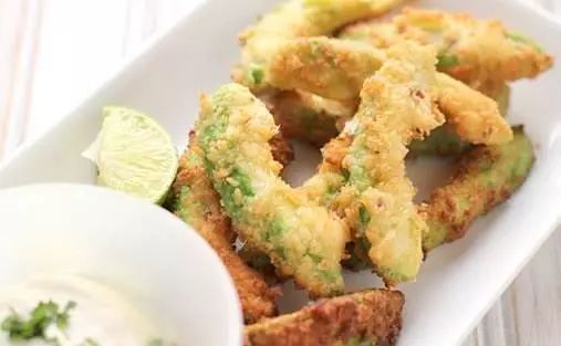 3、油锅加热后小心地将牛油果条放入,炸至金黄后取出沥干油分即可装盘。吃的时候可以配一些色拉酱或蛋黄酱。