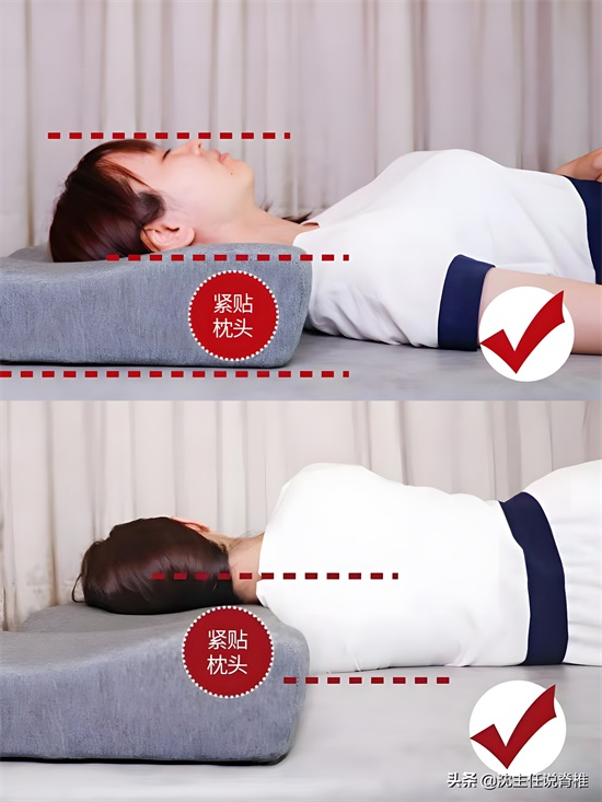 :躺下后,颈部不悬空,头部整体保持中正,避免过仰或者过低。这样既能支撑头部,又能与颈部的高度相适应。