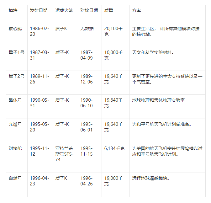 DOS-7,这也是“和平号”的核心舱段。但是在设计之初,核心舱(DOS-7)和DOS-8是作为“礼炮7号”的一部分。而后者一直到2000年才作为国际空间站的一部分发射升空,也就是国际空间站的漏气核心舱“星辰号”。和平号空间站是苏联在2代礼炮空间站的基础上发展的第三代空间站,其包括DOS系列的核心舱,独立平台的量子1号实验舱,FGB系列的量子2号实验舱、晶体号实验舱、光谱号实验舱、自然号实验舱,美国航天飞机对接节点舱。到1996年04月26日和平号增加美国出资的实验舱段与节点舱后,包括对接的一艘联盟与一艘进步飞船其最大在轨重量超过140吨,其中科研仪器设备超过11.5吨。相较于礼炮号空间站其具备多实验模块的组合,可满足航天员的多科目实验与长期驻留。