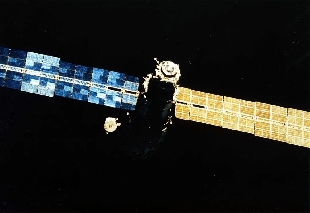 联盟TM-3号飞船拍摄的和平号空间站核心舱与量子一号实验舱组合体,图片的飞船为联盟TM-2(TM-1为无人试验船,因此TM-2为第一艘载人的联盟TM型号飞船)