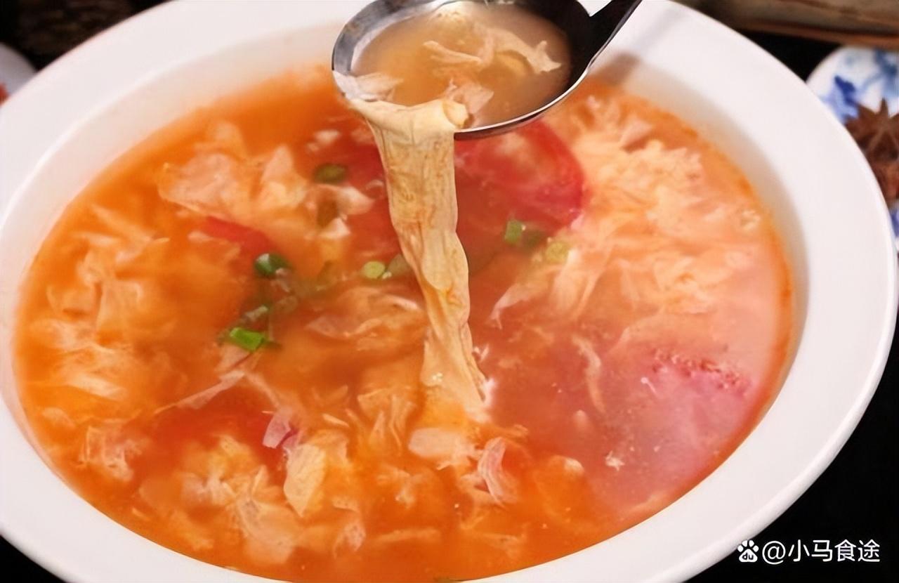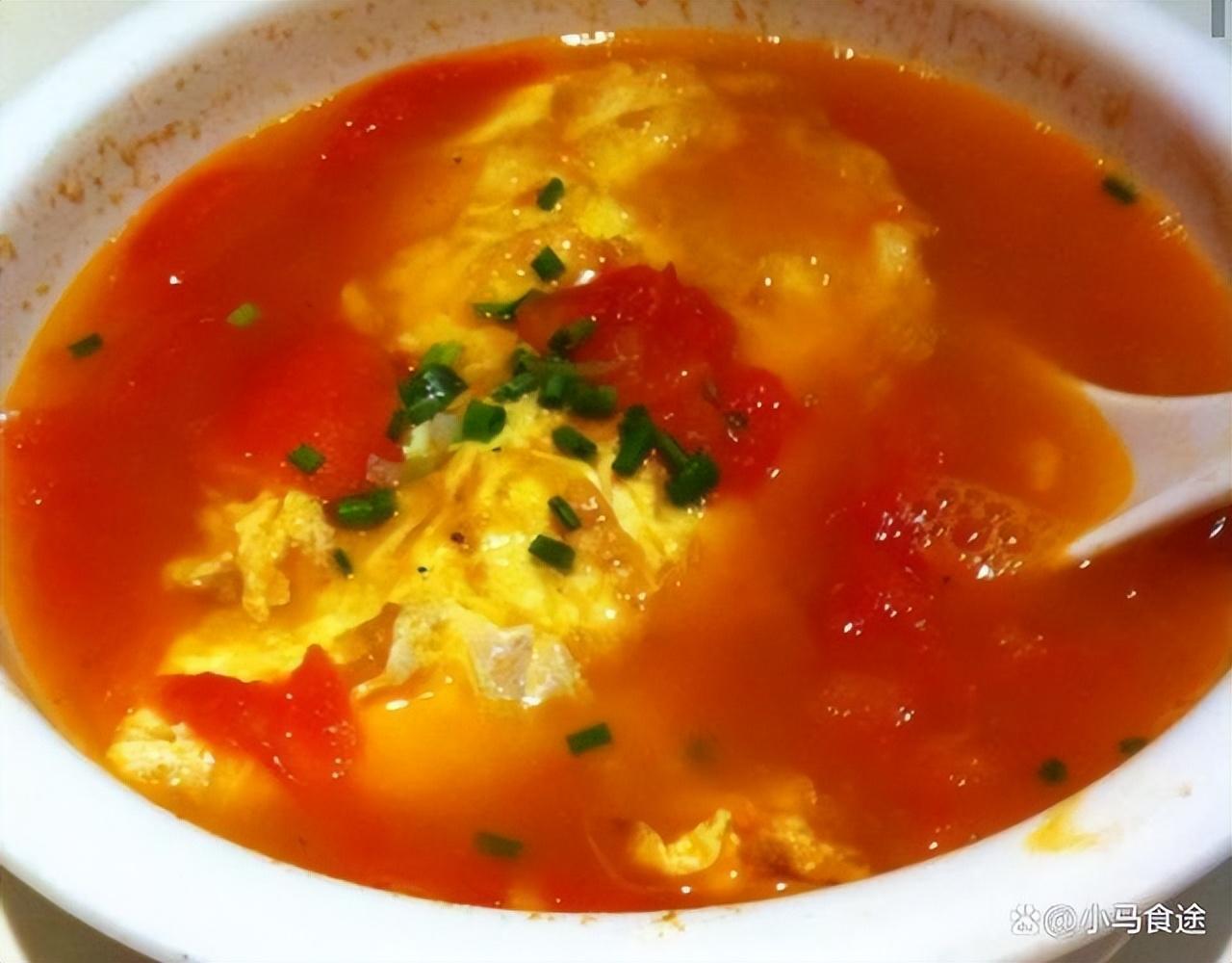 西红柿煎蛋汤,汤色红润,鸡蛋经过炸制,再放入汤中浸煮,配点细面条更好吃。