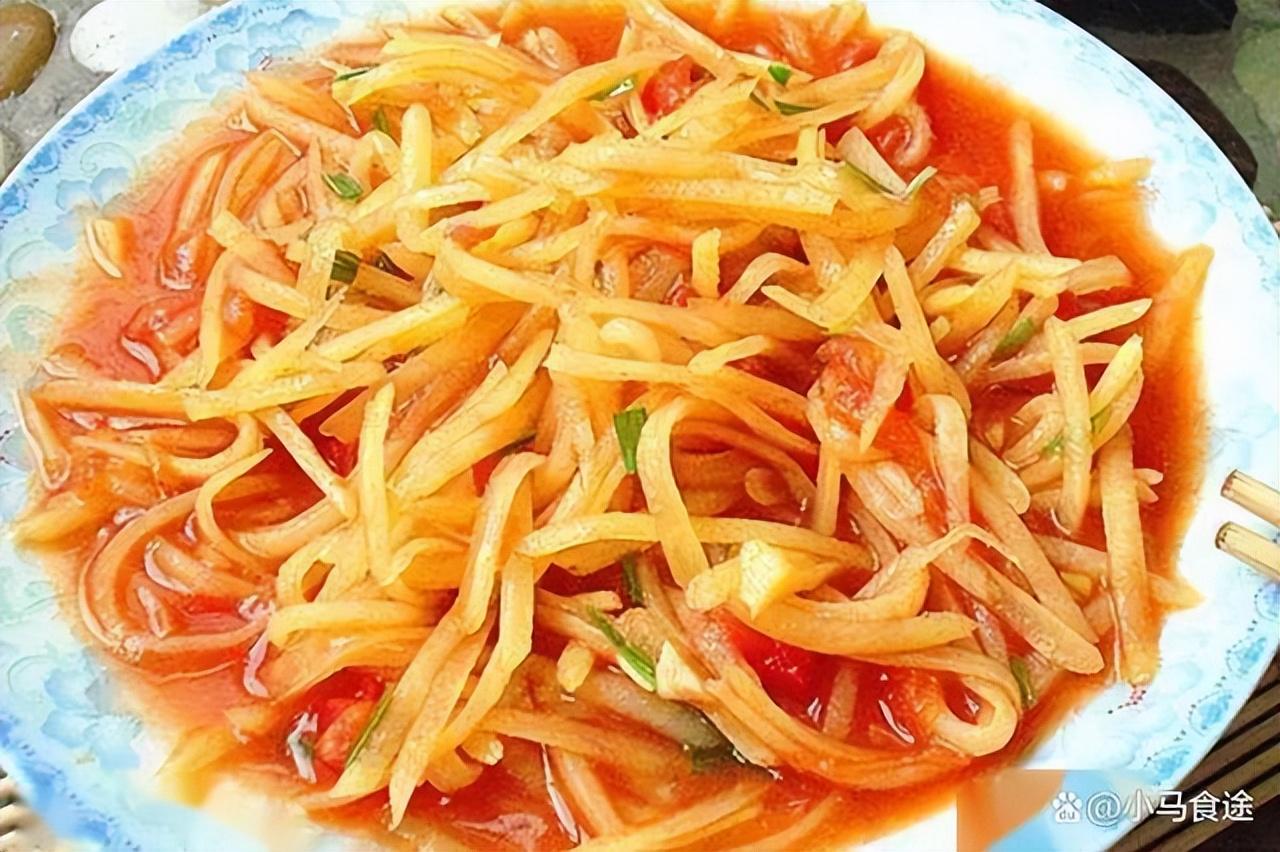 番茄土豆丝,土豆丝清脆,番茄开胃,吃着特别清爽,汤汁拌饭也非常好吃。