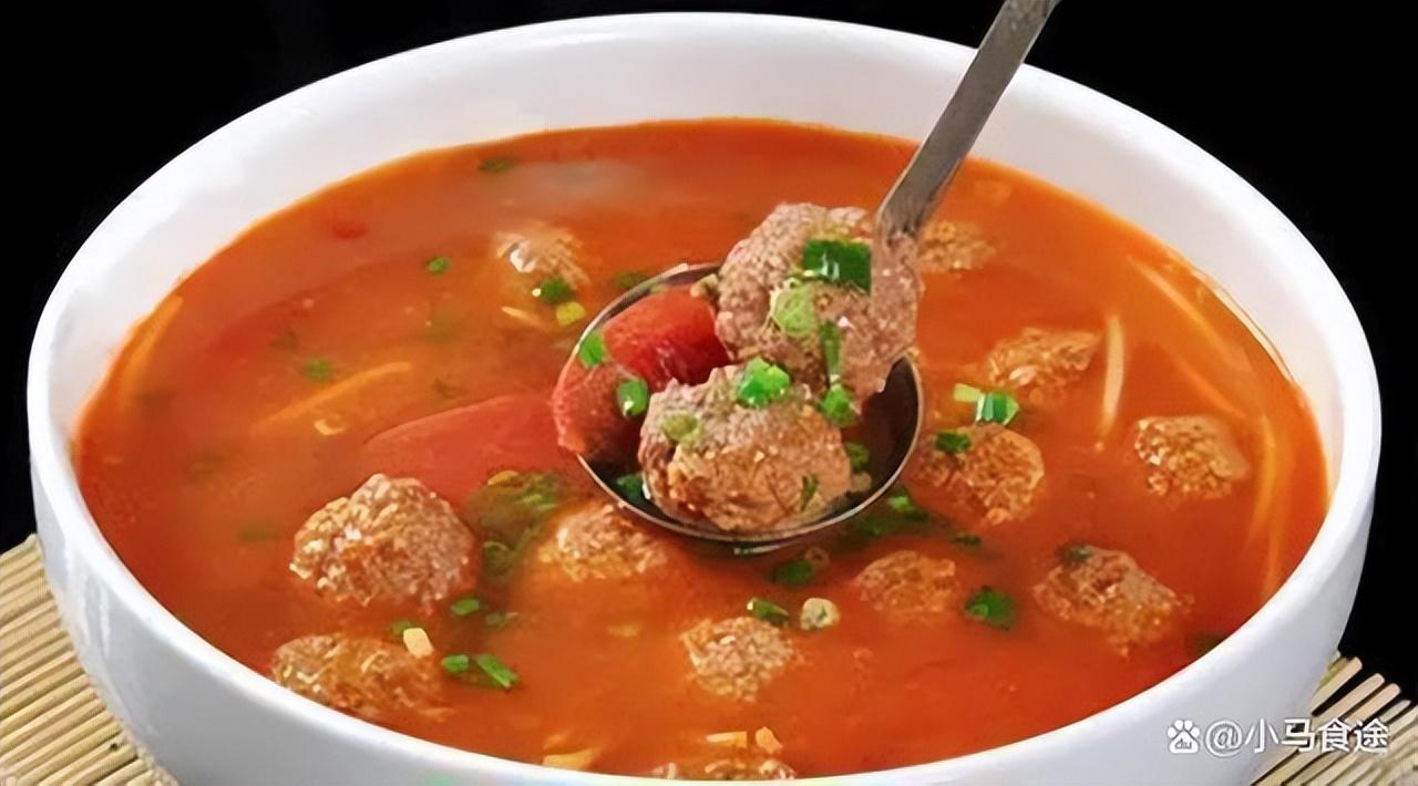 西红柿肉丸汤,西红柿的原汁配上猪肉丸的肉香,二者融合更为香浓,好吃又好喝,这样的汤菜大人孩子都爱吃。