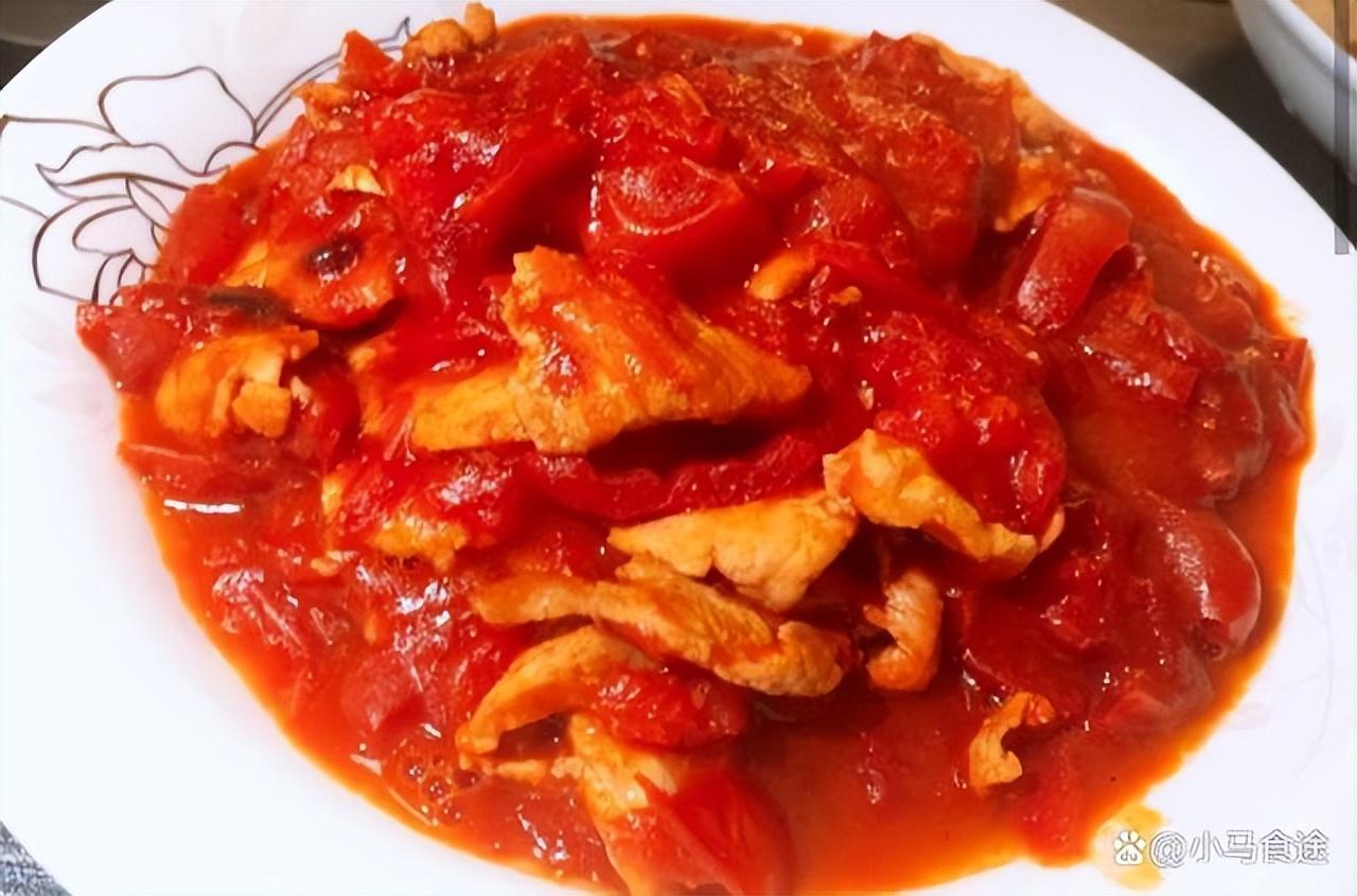 西红柿肉片,过油肉片用西红柿来一起烹炒,肉片细嫩,汤汁拌饭更好吃。