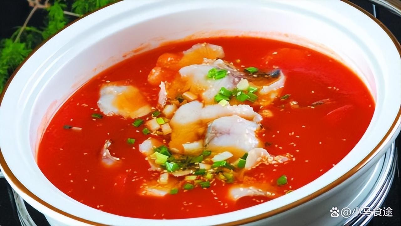 番茄鱼片,鱼片细嫩,番茄味浓,汤色红润,口味略带酸甜。