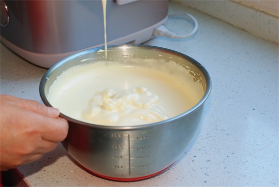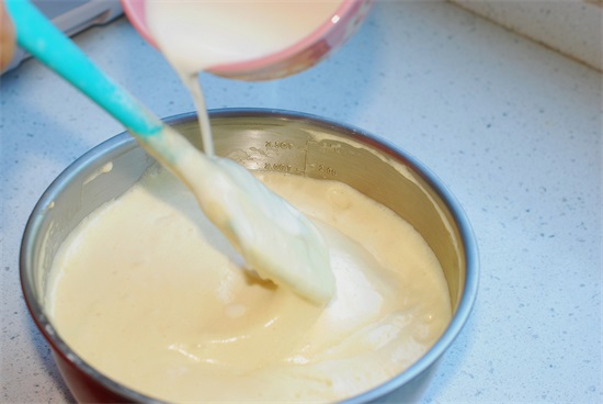 步骤七:玉米油和牛奶先混合均匀,然后分两次顺着硅胶刮刀倒入蛋糕糊中,翻拌均匀后再加入第二次。