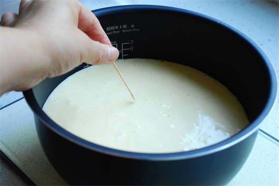 步骤八:最后的蛋糕糊非常细腻,倒入预热好的电饭煲中,轻震几下震掉大气泡,如果表面还有大气泡,可以用牙签划拉几下。