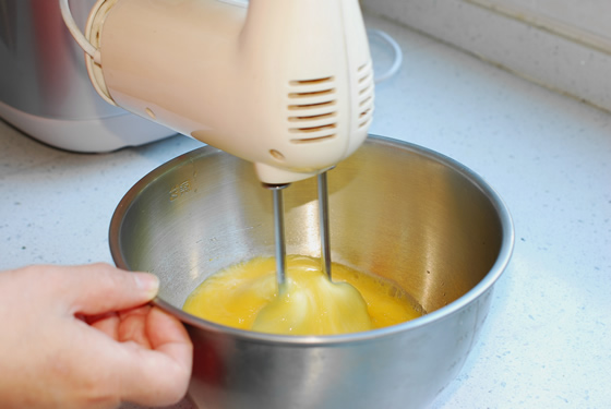 步骤四:开启电动打蛋器,先低速再转高速开始打发。全蛋打发的温度在40度左右最好,所以可以隔热水打发蛋液,缩短时间。