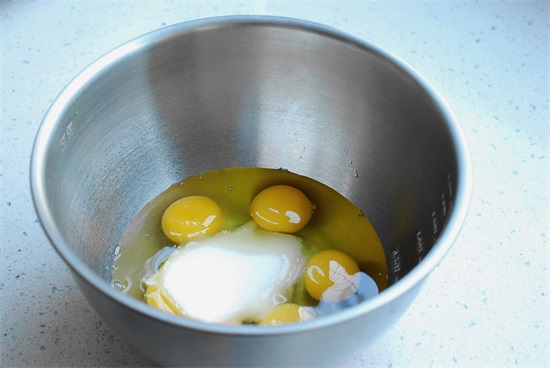 【食材】:鸡蛋6个,牛奶65克,玉米油40克,低筋面粉135克,细砂糖80克