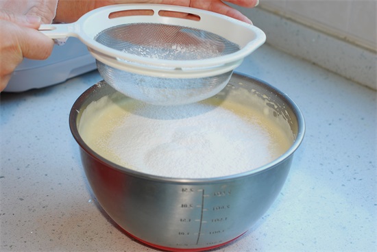 步骤六:低筋面粉分成2次过筛到蛋糊中,翻拌的手法混合均匀,不要来回搅拌小心消泡。