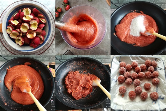 5.山楂果泥炒到抱团(炒山楂果泥没有放油,锅铲会粘果泥是正常现象)
