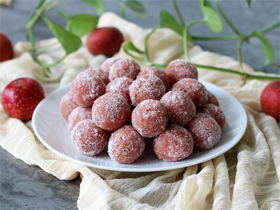 6.戴一次性手套,取适量的山楂馅,揉圆裹上一层细砂糖防粘。