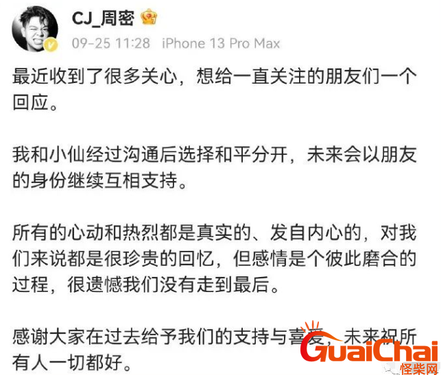 很长的一段时间里,他们都被称为“说唱圈模范情侣”。但就是这样一对情侣,昨天却官宣分手了。周密说,感情需要彼此的磨合,很遗憾他们没有走到最后未来会以朋友的身份走下去。周芯竹说,四季不止有夏天,我把你还给你。