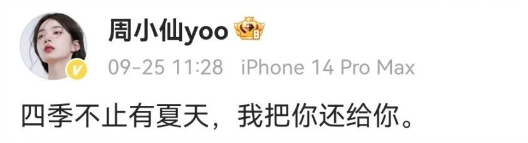 男方的文案:不爱了,各自安好,不要锤我。 女方的文案:还爱,但无法继续下去,只能将他归还于人海了。因为四季不止有夏天的下一句是你不止有我。文案也显而易见了可能是周密变心了甚至有了新欢。