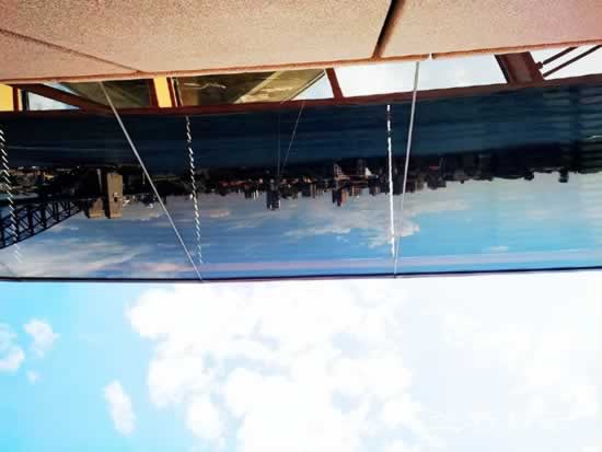 这是观景台上方的遮阳棚,很巧妙地使用了镜面材料,刚好将对岸的风景全部反射出来。