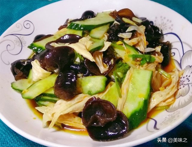 5、把木耳,腐竹,黄瓜,放到碗内,倒入调好的料汁,搅拌均匀装盘。