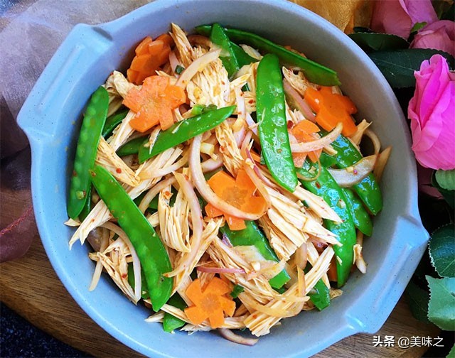 荷兰豆适量、胡萝卜一根、腐竹适量、葱适量、蒜适量、洋葱适量、油适量、盐适量、醋适量、酱油适量、辣椒粉适量。