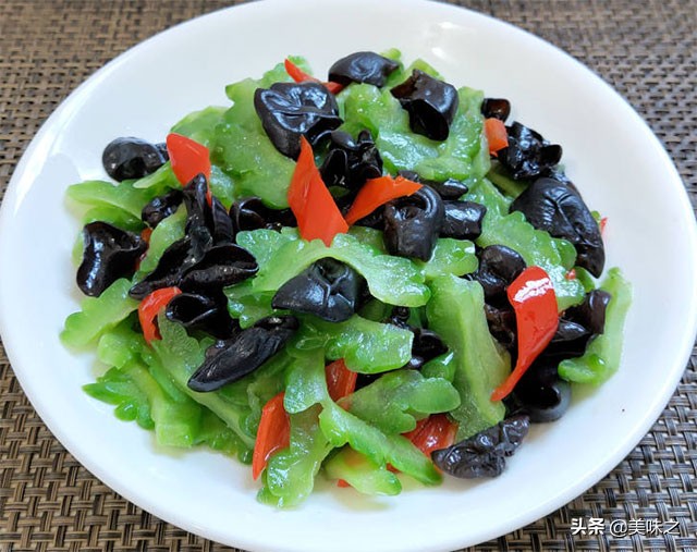 苦瓜1根、黑木耳25克、青椒1个、盐2克、鸡精2克、油几滴。