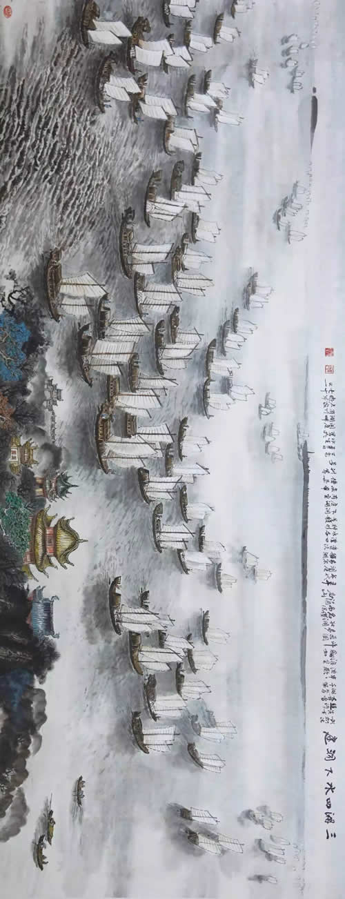 北宋诗人梅尧臣曾经写道:“风帆满目八百里,人在岳阳楼上看。”如今,连通长江和三湘四水的洞庭湖航道依然繁忙,但满目风帆早已不见踪影,取而代之的是各种用钢铁铸造的现代化船舶。李水生也只能用手中的画笔,去复刻时光里的风帆点点: