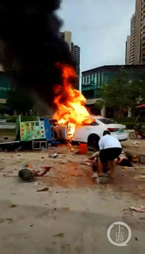 9月18日,目击者吴先生告诉记者,自己在事发地点附近上班,当时离事发地点约200米,涉事的白色轿车先是撞上路边的水果、麻辣烫等摊档,引起煤气罐爆炸起火。事发后消防人员很快就到达了现场,并拉起警戒线。