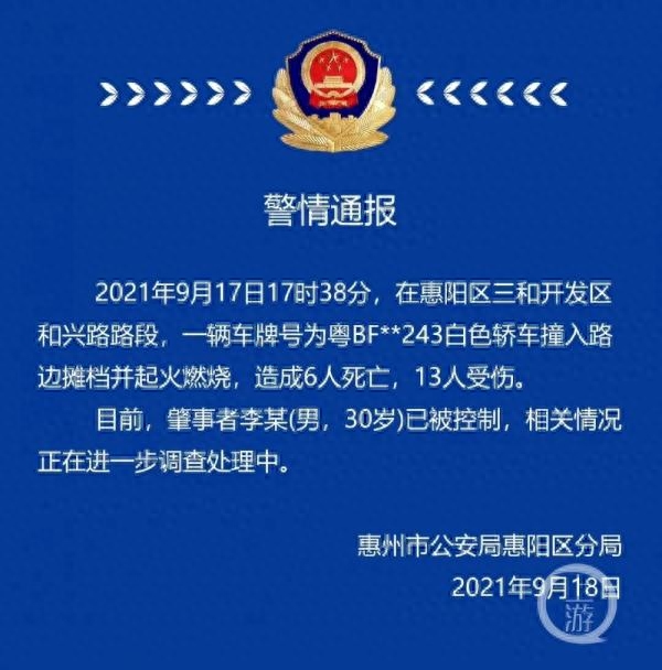 9月18日,广东省惠州市公安局惠阳区分局官方微博通报称,9月17日17时38分在惠阳区三和开发区和兴路路段,一辆白色轿车撞入路边摊档并起火燃烧,造成6人死亡,13人受伤。