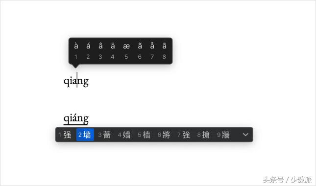 带声调字母的输入在 iOS 上非常简单:只要按住对应的字母键,就可以在弹出的浮动条中看到它们。这一技巧同时适用于中英文输入法,但带上声 ˇ 的字母只在中文键盘上才能找到。macOS 上,最简单的方法是切换到中文输入法,直接输入需要注音的字的拼音,然后按 Tab 键,就会发现韵母上出现了声调。反复按 Tab 直到看到所需的声调,然后直接回车即可上屏。另外,较新版本的 macOS 借鉴了 iOS 上的交互方式,长按键盘上的普通字母即可看到与其相关的带声调版本。