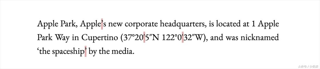 撇号(apos-tro-phe)是英文中用来标示所有格(John’s apple)和省略(isn’t)的符号,其正确形态是一个右单引号,即 ’(U+2019 Right Single Quotation Mark),因此同样需要注意避免用成直引号。另外,对于 rock ’n’ roll 这样连用撇号的情形,要特别注意撇号的方向:字母 n 两侧的撇号很容易被系统自动「修正」为一对引号;这也是为什么提倡尽可能直接用组合键输入引号,而不是依赖软件纠正。