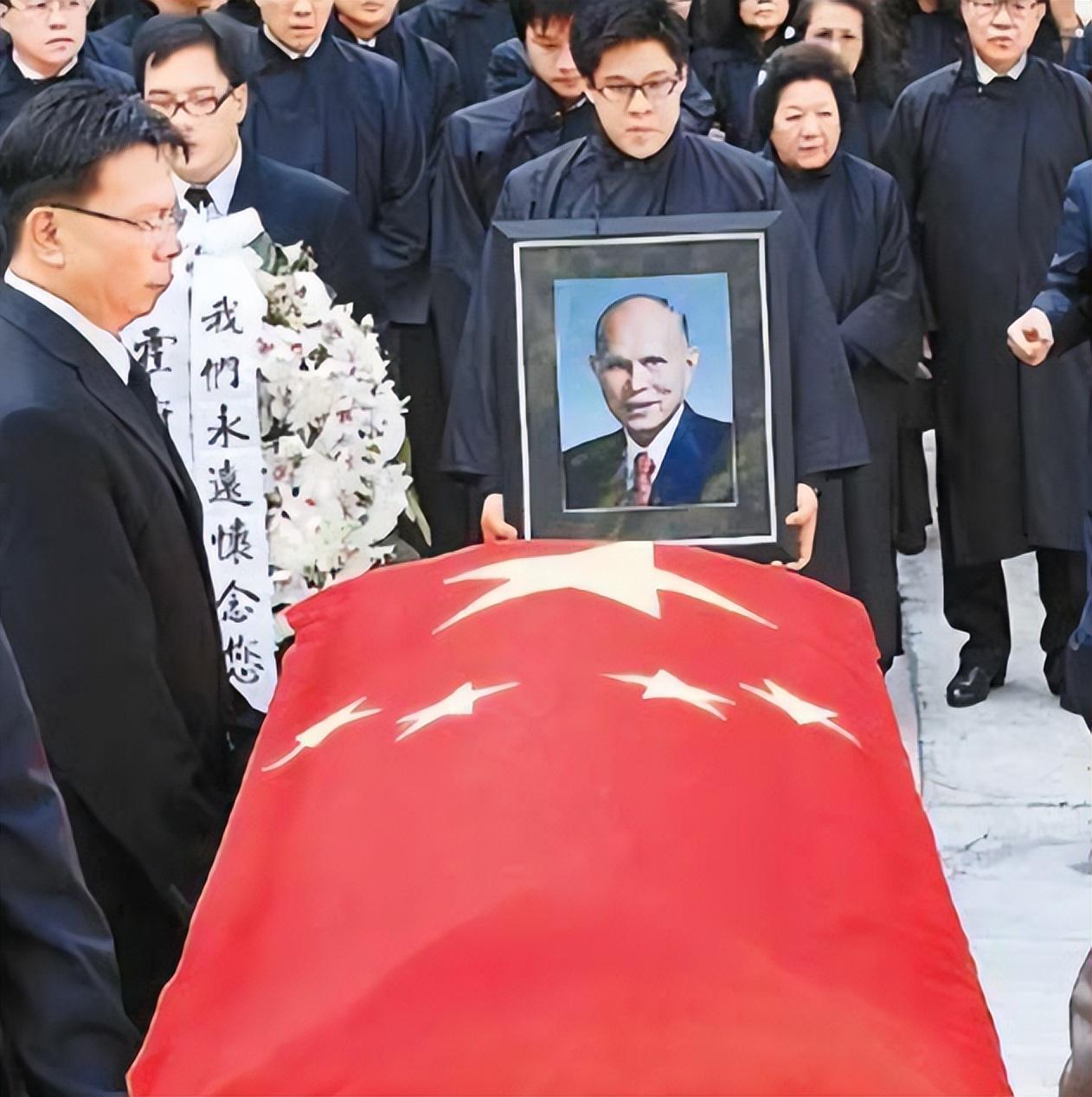 送葬的棺椁不仅外盖红旗,警车开道,而且还有赌王何鸿燊和李嘉诚等人为其扶灵,
