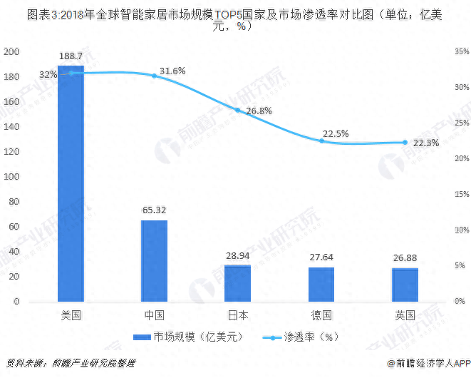 2018年我国智能家居市场规模65.32亿美元,渗透率仅4.9%