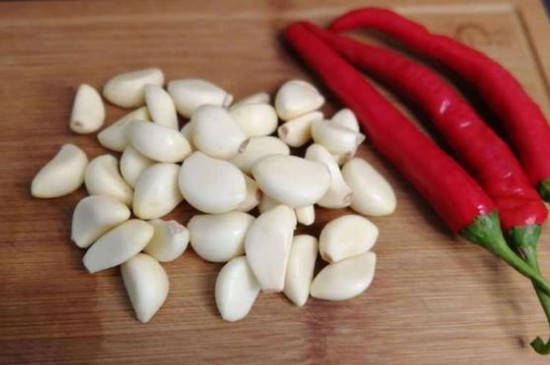 大蒜去皮,和红辣椒一起,在清水中洗干净,控干水分。