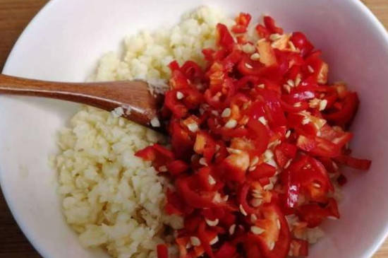 将清洗干净的大蒜和红辣椒用刀剁碎,放入一个无水无油的容器中备用。