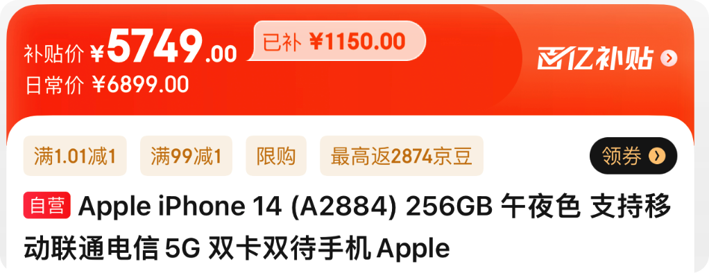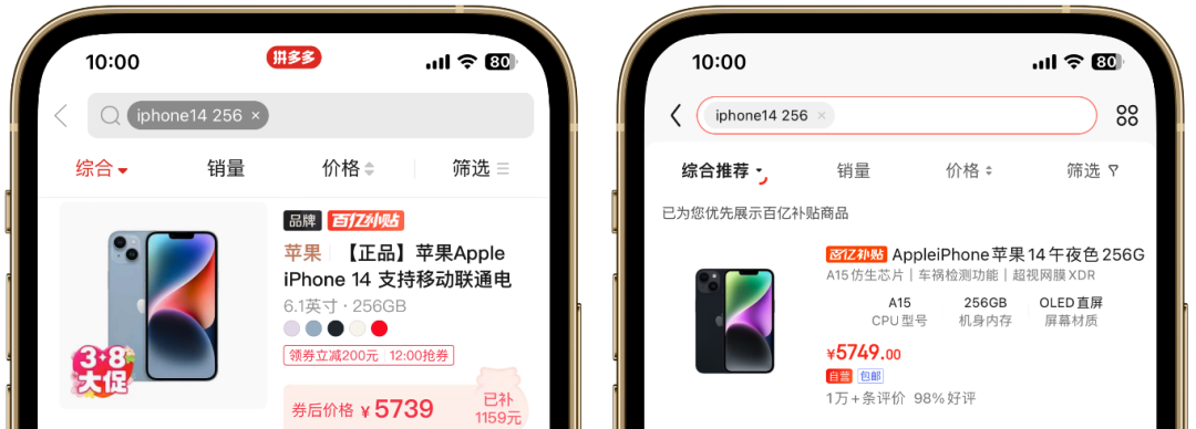 首先,拿顶配iPhone 14 Pro Max举例,同样是百亿补贴,京东比拼多多便宜80块: