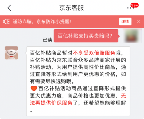 好在鸭鸭咨询了官方客服,确定京东目前针对百亿补贴商品,不提供价格保护: