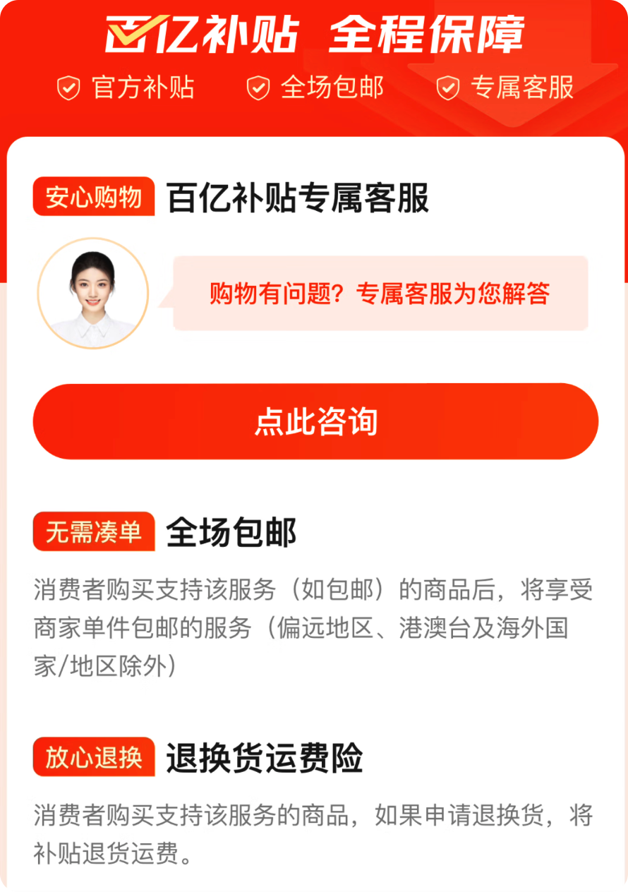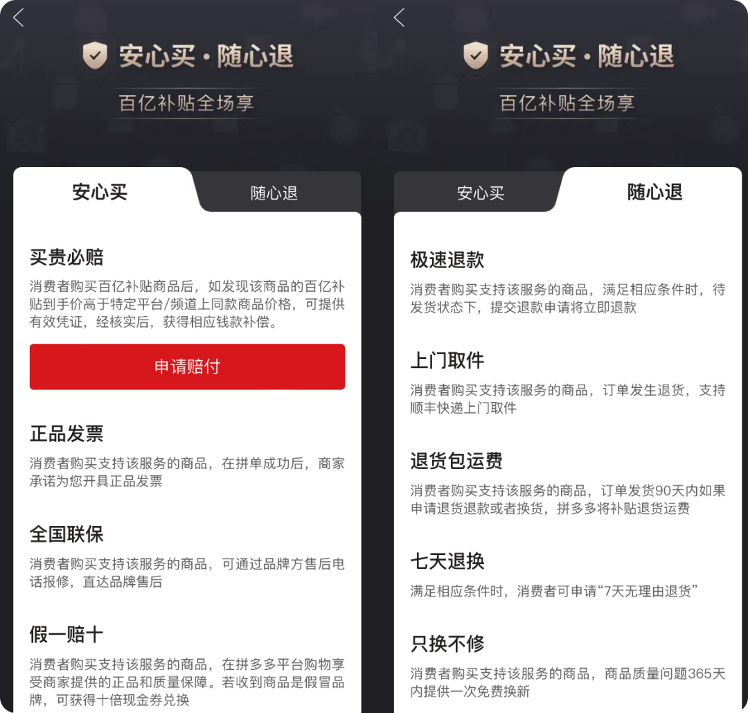 拼多多在百亿补贴的页面说明中,提供了“安心买”和“随心退”两大项、十几小项服务: