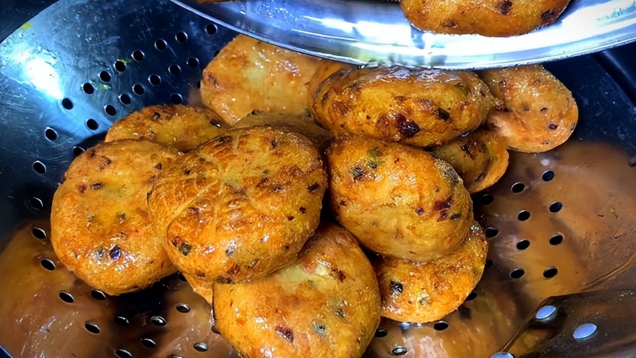 起锅加入多一点食用油,下入筷子冒小泡,将做好的面团一个一个下入油锅,用铲子轻轻推动,开中小火慢炸,炸制小饼金黄,捞出放在漏勺中备用。