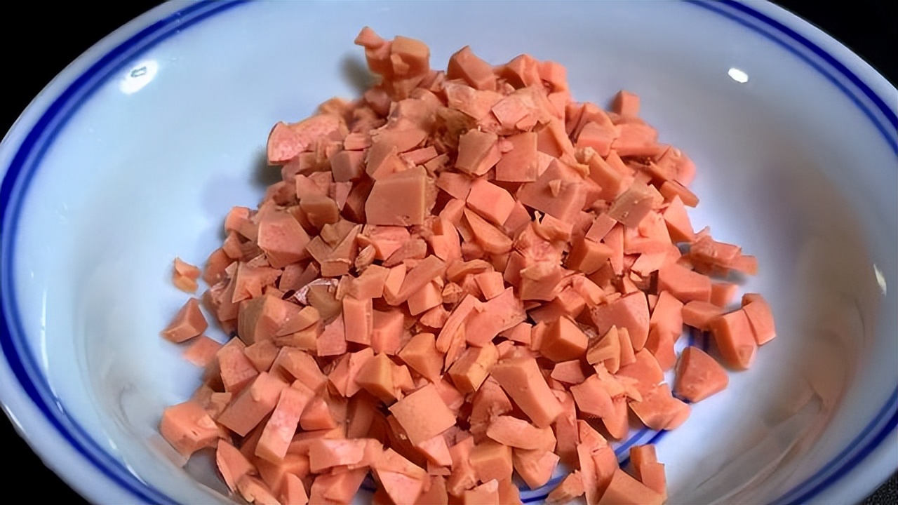 胡萝卜削去外皮,清洗干净,切成薄片,最后再切成小丁,全部切好后,在碗中备用。