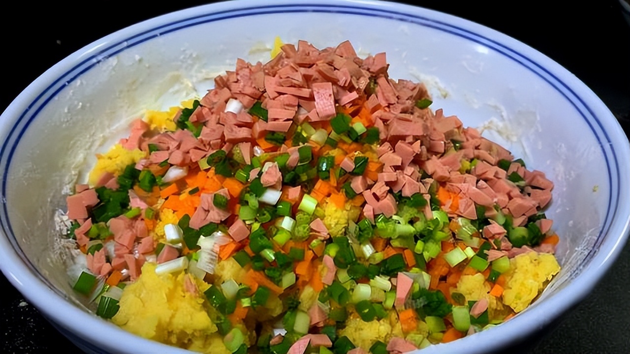 面团处理好把玉米面倒进里面,胡萝卜丁,葱花和火腿肠也倒下去,用手抓拌均匀,把里面玉米面和面粉充分融合在一起,用手整理一下,盖上保鲜膜发酵半个小时。