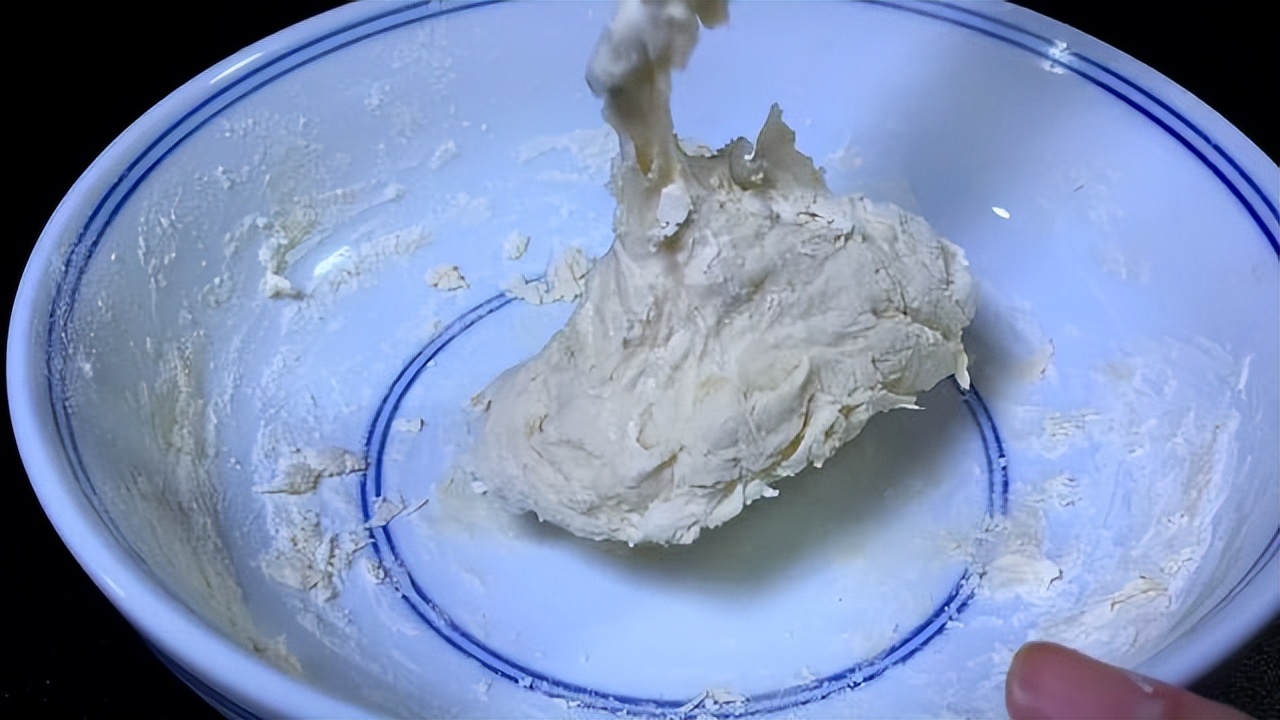 大碗加入面粉,搅拌好酵母粉一边倒一边搅拌,搅拌至没有干面粉的状态就可以了。